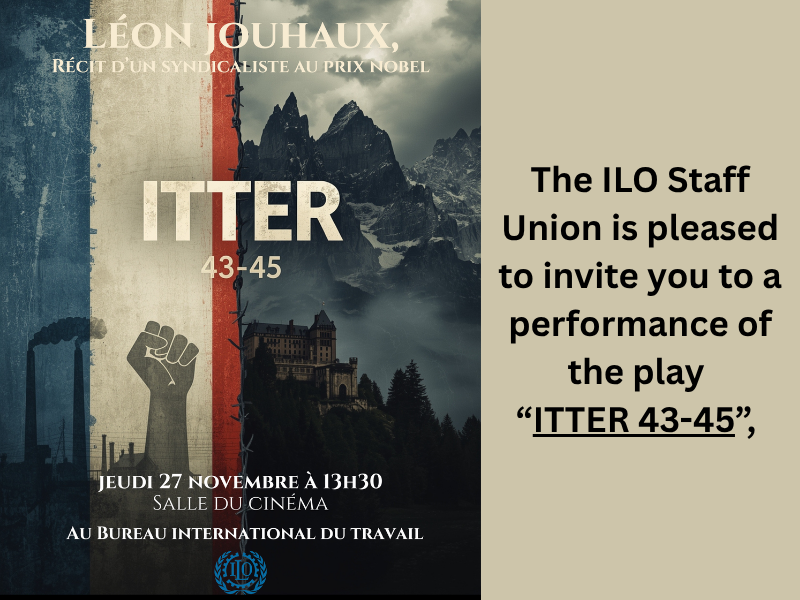 Le Syndicat du personnel de l’OIT a le plaisir de vous inviter à une représentation de la pièce de théâtre « ITTER 43-45 », l’histoire de Léon Jouhaux, le récit d’un syndicaliste au Prix Nobel et une figure centrale du syndicalisme international et acteur majeur de l’OIT de 1919 jusqu’à sa mort en 1954.